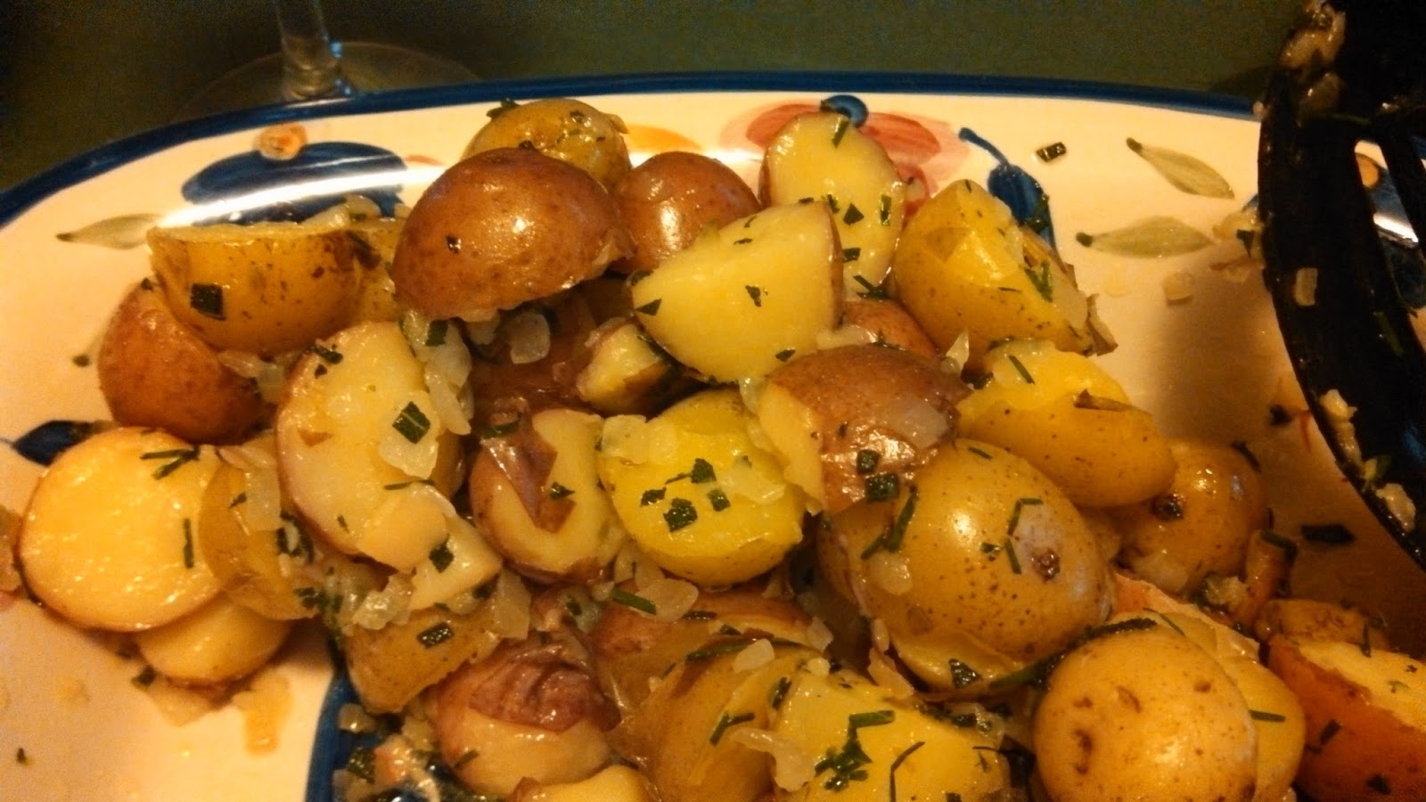 - Cut potatoes in half and place in serving bowl with butter, shallots and herbs. Add minced chives and salt and pepper. Enjoy!